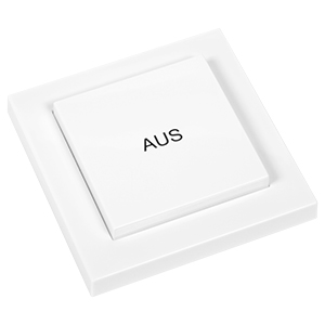 Diese Komplettversion des Wandtasters RTS22 enthält alle benötigten Komponenten, um sofort in Betrieb genommen zu werden. Das Sendemodul, ein weißer Rahmen und eine weiße Einzelwippe mit der Beschriftung "AUS" sind im Lieferumfang enthalten.