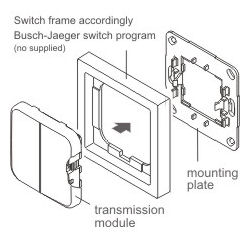 The transmitter is compatible with the Busch-Jaeger switch range. The transmitter module is combined with the desired rocker, simply clicked into the cover frame and is immediately operational. It can then be mounted on the wall using either adhesive pads or screws.